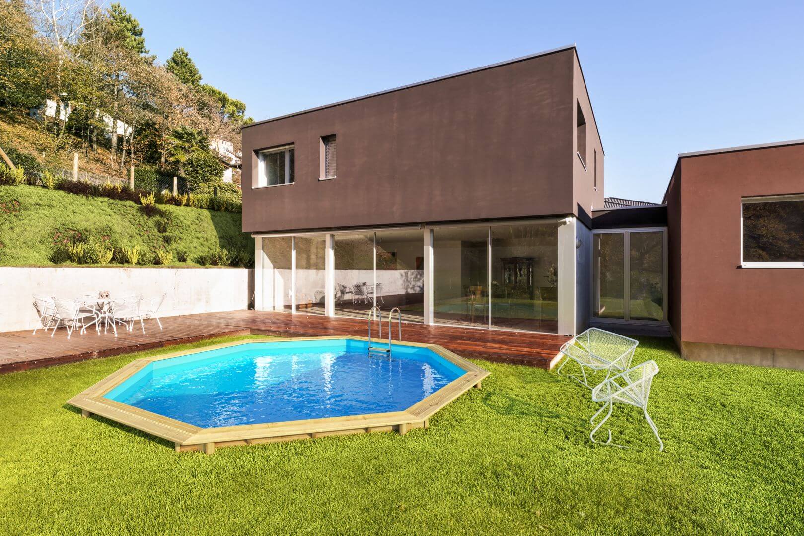 5. Эстетичный внешний вид деревянного бассейна впишется в ландшафт любого сада.