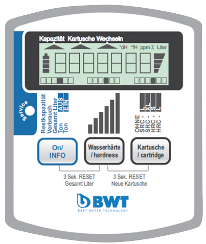 ▪ счетчик воды с цифровым дисплеем, электронной настройкой параметров воды и контролем ресурса картриджа