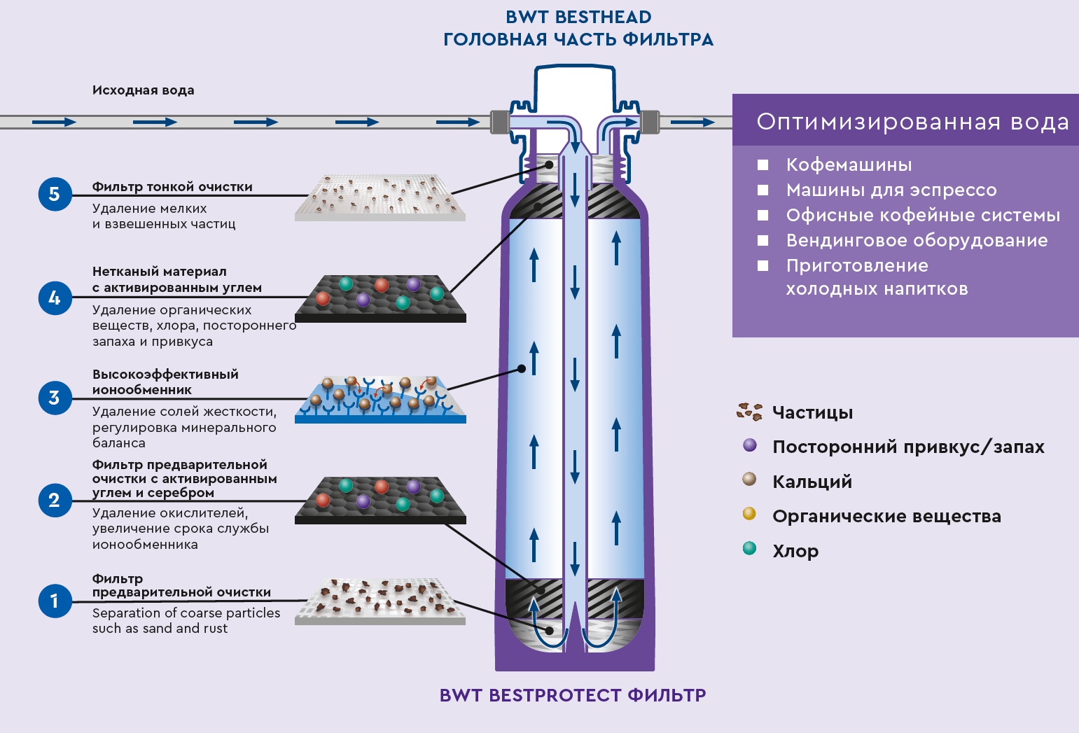 BWT bestprotect - это решение оптимизации воды с особыми характеристиками. Фильтр не только предотвращает образование отложений и гипса, но также обеспечивает постоянно высокое значение pH. Таким образом, BWT bestprotect защищает дорогое технологическое оборудование от отложений и предотвращает проблемы связанные с коррозией деталей из нержавеющей стали. Кроме того, эта система фильтрации обеспечивает подачу воды с превосходными органолептическими характеристиками для производства высококачественных горячих напитков.