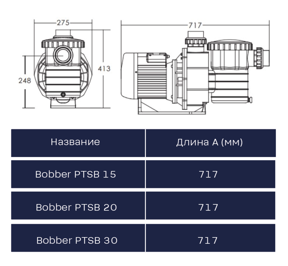 | Модель | Насос для бассейна BWT Bobber PTSB 15 | Насос для бассейна BWT Bobber PTSB 20 | Насос для бассейна BWT Bobber PTSB 30 |