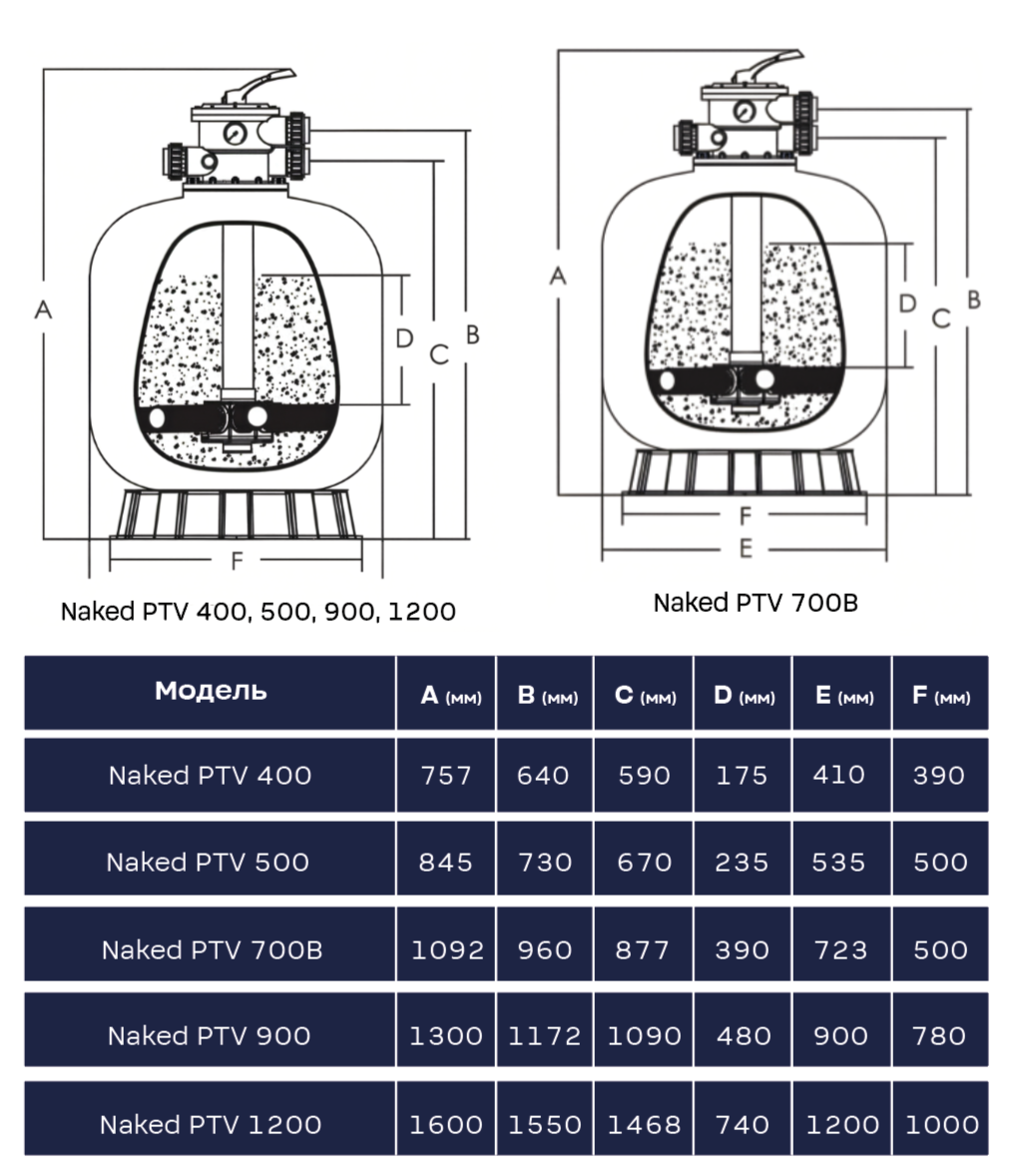 Песочные фильтры Naked PTV с верхним подключением шестипозиционного клапана.