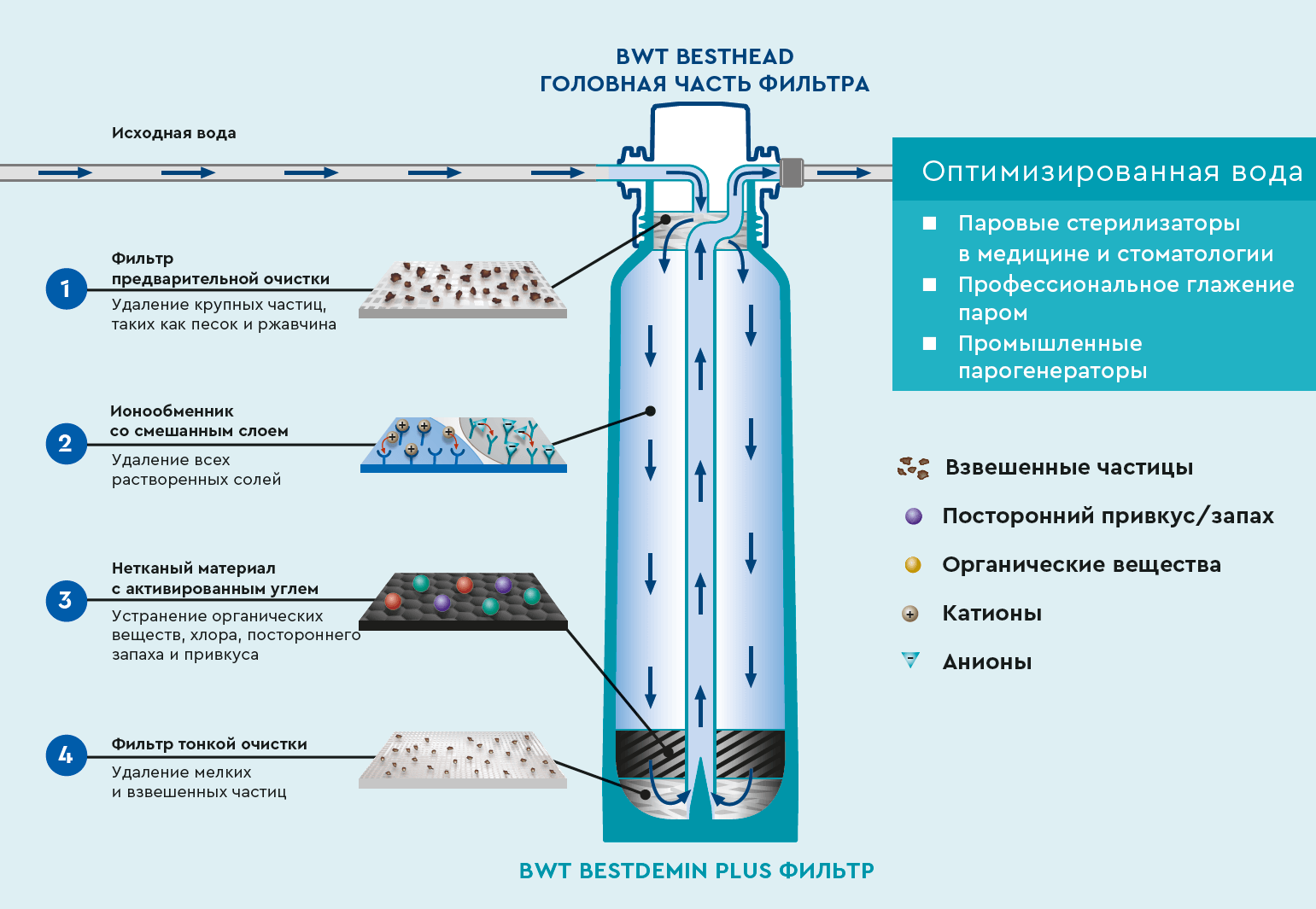 BWT bestdemin PLUS представляет собой систему фильтрации, которая производит полностью обессоленную воду без каких-либо усилий. Этот многоступенчатый фильтр оснащен ионообменником со смешанным слоем, который удаляет все растворенные соли из поступающей исходной воды.